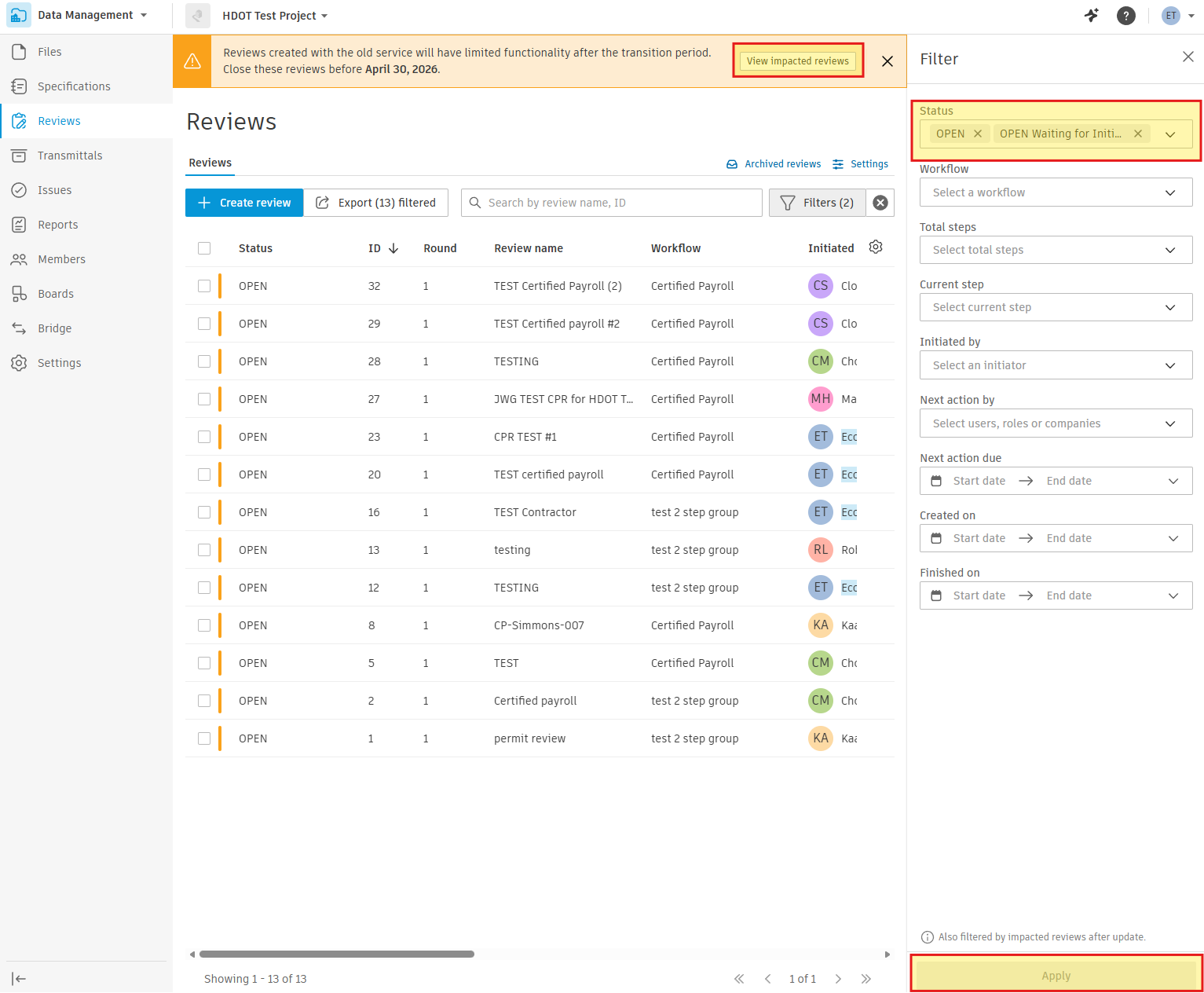 To see which reviews are impacted, use the “View Impacted Reviews” button in the Reviews module banner (shown in the screenshot above). You can filter by status — such as Open or Open Waiting for Initiation — to quickly locate and close any outstanding reviews before the deadline. Please plan to address these before April 30 to ensure no disruption to your team’s document approval workflows. Reach out with any questions.